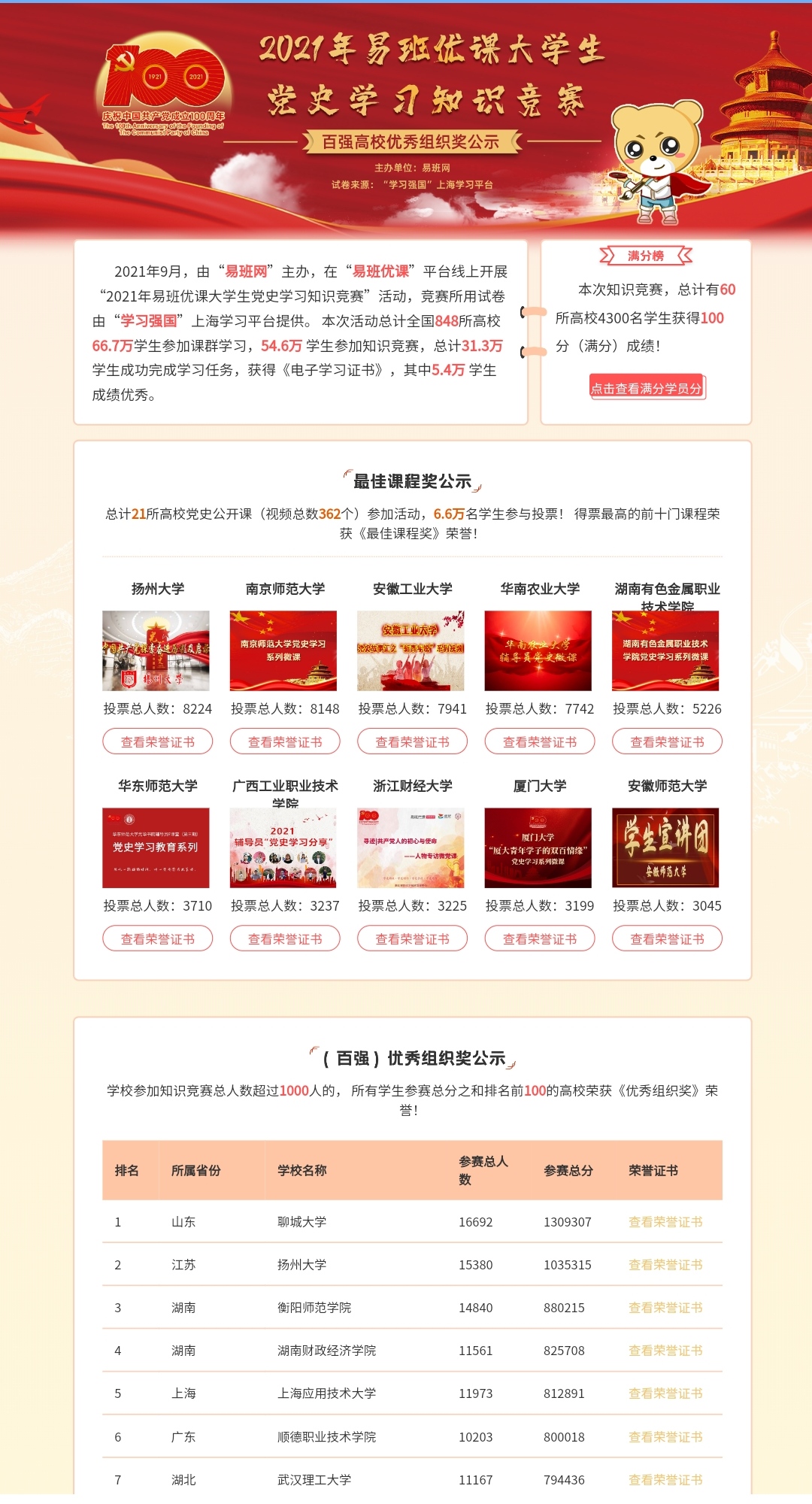 学校共有15380名学生参与此次活动,参赛总分位列全国高校第二名,荣获“优秀组织奖”。在“最佳课程”评选中,共有21所高校党史公开课(视频总数362个)参与评比,6.6万名学生参与投票,得票最高的前十门课程获“最佳课程奖”荣誉,我校《中国共产党探索奋进历程及启示》课程荣获最佳课程第一名。