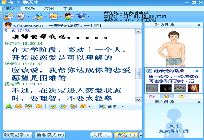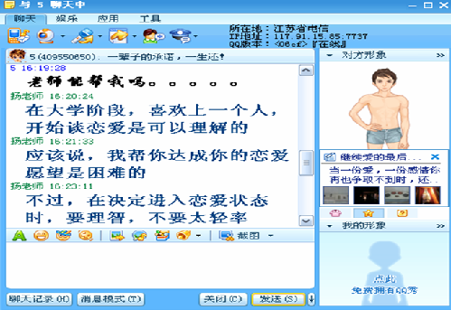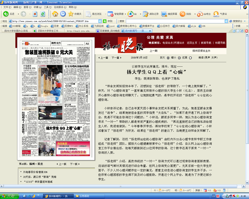 为进一步增强心理健康教育工作的有效性,我校心理健康教育中心根据当代大学生的心理发展特点、学习与生活特征,寻找心理健康教育工作与学生学习生活的交叉点,发挥网络遍及性、便捷性与匿名性的特点,于2008年5月推出了“扬老师QQ在线心理咨询”。推出之后,网络优势的特点得到充分体现,及时有效地帮助了一些存在心理困惑但羞于进入心理访谈室的学子,受到了众多学生的欢迎。