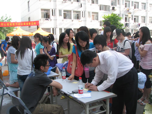 5月25日,我校在荷花池校区、瘦西湖校区、文汇路校区、淮海路校区、江阳路北校区、江阳路南校区、扬子津校区等公寓区同时开展“扬州大学2010年心理健康节进公寓宣教活动”。专家现场心理咨询、心理健康知识展板、玩转世博、心理测试、心灵邮箱、心愿放飞、许愿树、信任背摔、心情舞蹈、互动小游戏、宣传资料发放等精彩的活动,吸引了众多学子热情参与。校党委副书记、副校长芮鸿岩莅临活动现场,与广大学子共度大学生心理健康节。