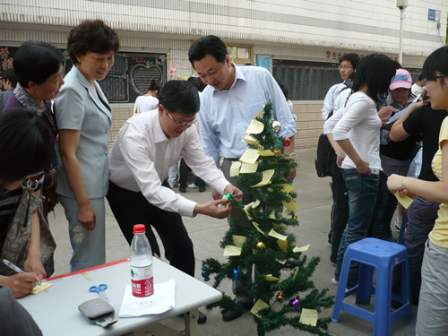 在活动现场,芮书记非常认真地与大家一起参与了信任背摔、世博馆名竞猜、许愿树、破碎烦恼等活动,在许愿树上热心地贴上“祝每一位同学都身心健康,快乐向上”的心愿。