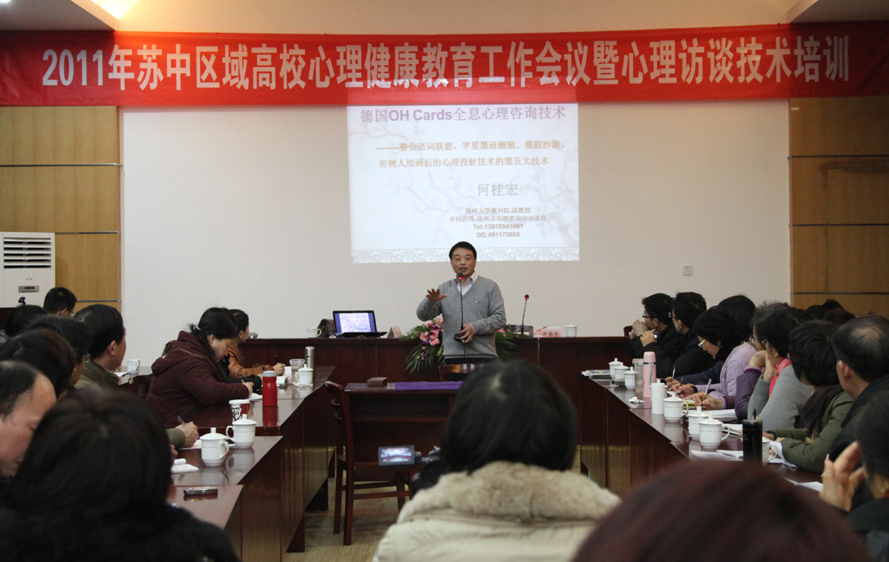 会议期间,我校教育科学学院何桂宏老师做了《心象牌技术在心理咨询中的应用》的工作坊,邀请了扬州市心理卫生中心吴人钢主任做了《心理咨询:了解与沟通》的专题报告。