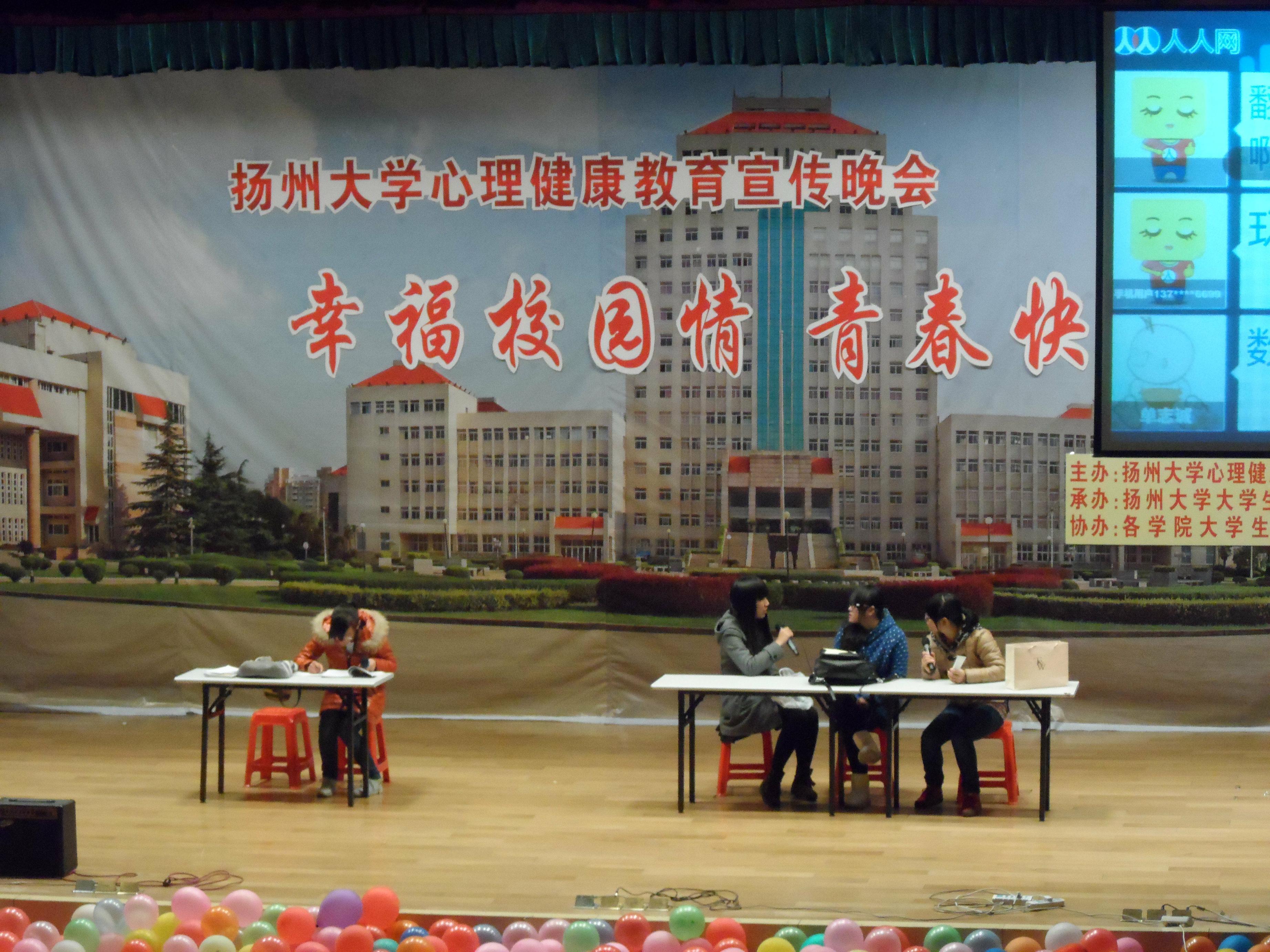 11月29日,我校心理健康教育宣传晚会在扬子津校区昭文馆报告厅举行。校学生处副处长、心理健康教育中心主任周春开、我校部分专兼职心理访谈员、扬子津校区各学院团委老师出席晚会。