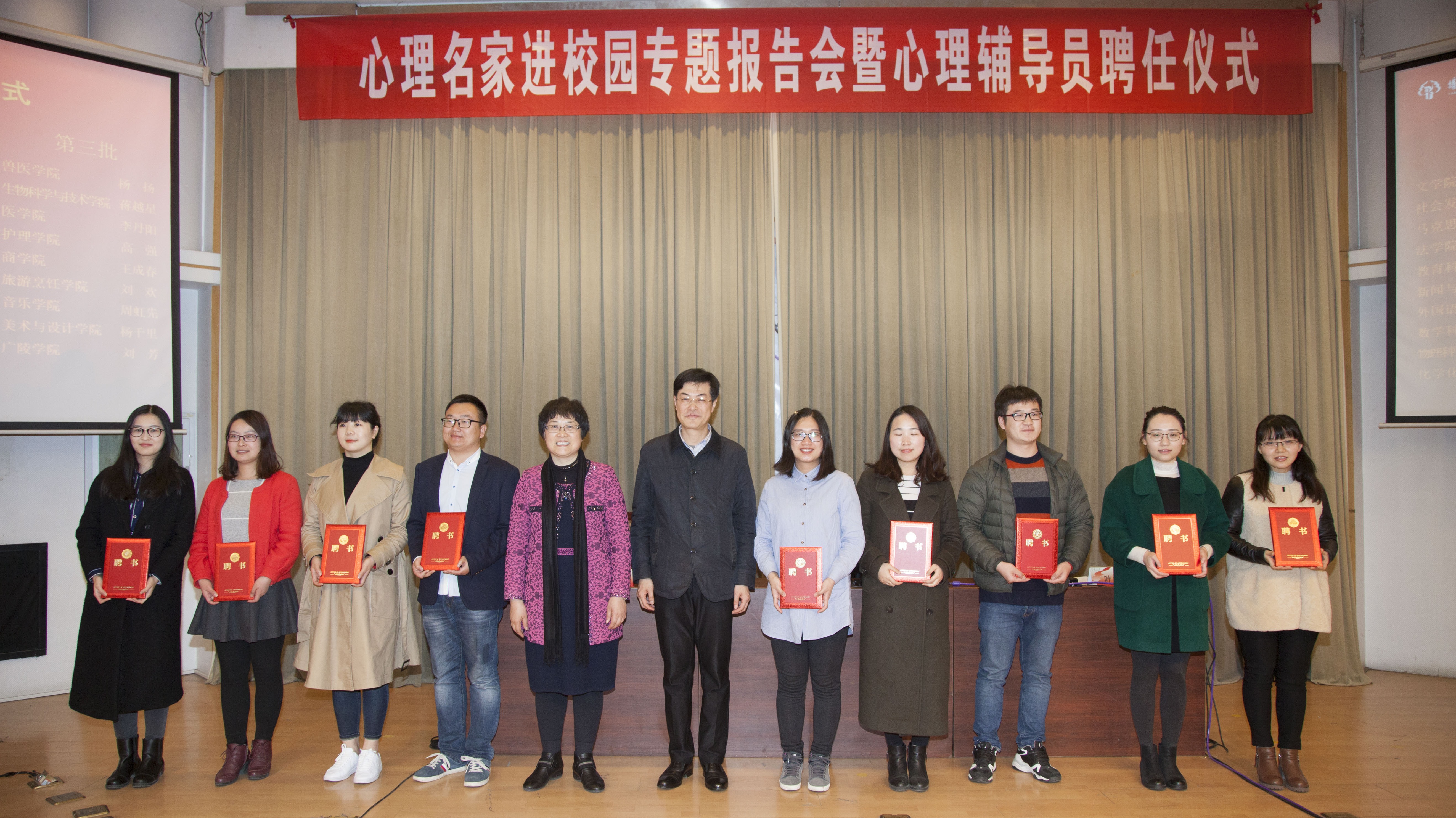 全体辅导员、班主任代表,校专兼职心理访谈员、公寓管理员,扬州市高校心理专职人员三百余人参加了报告会。报告会开始之前,我校举行了心理辅导员聘任仪式。桑志芹教授和叶柏森副书记、副校长向名学院心理辅导员颁发了聘书。