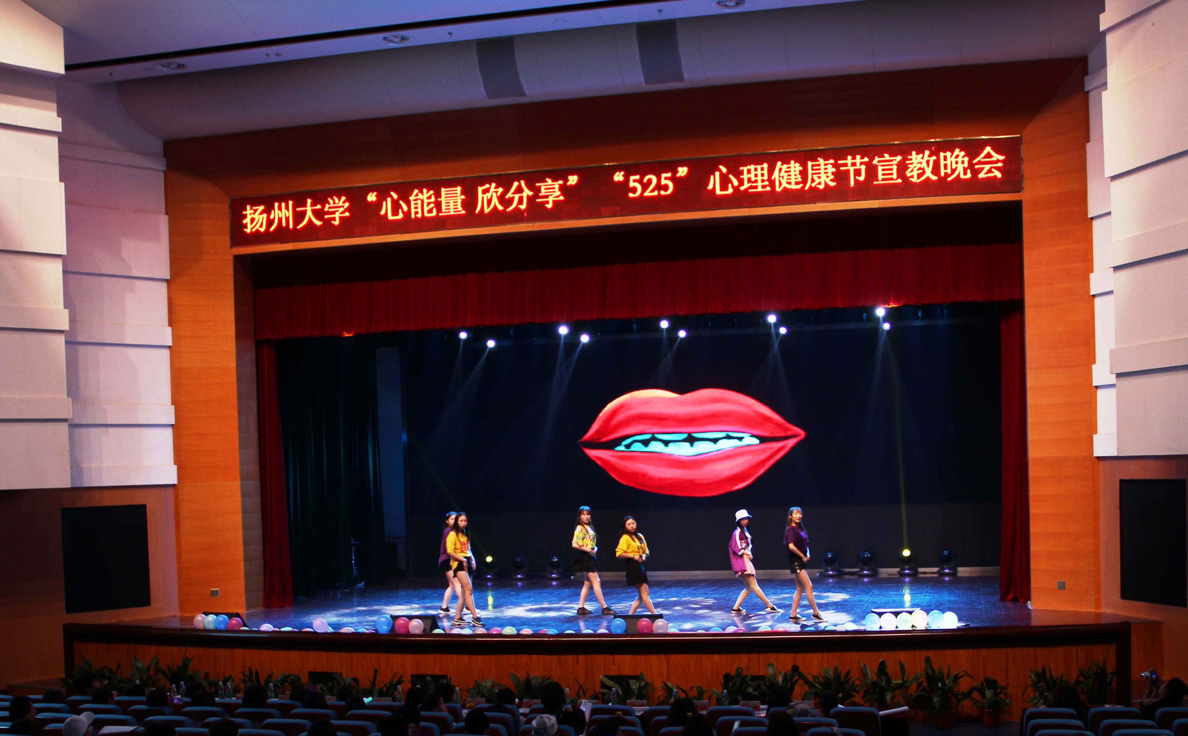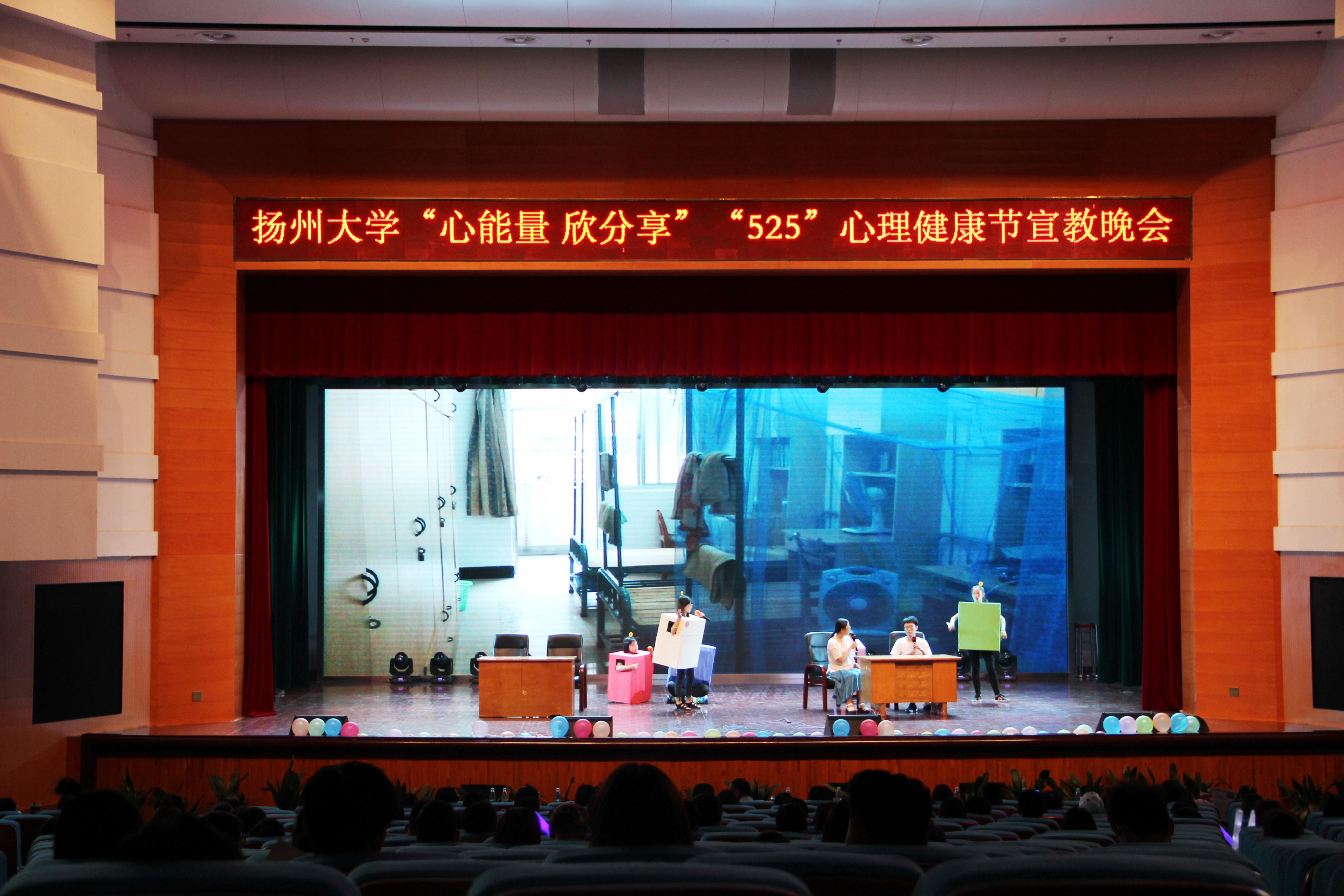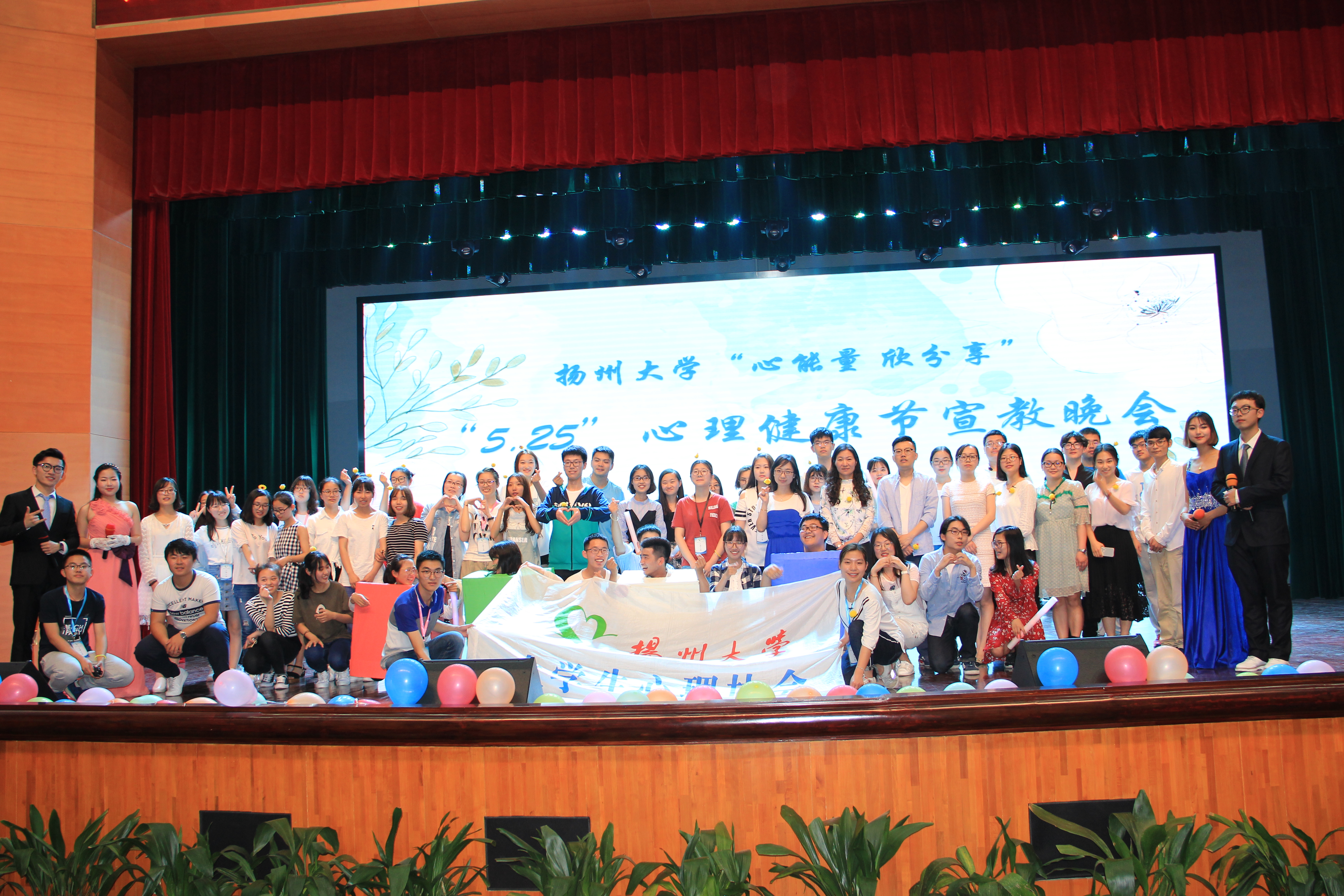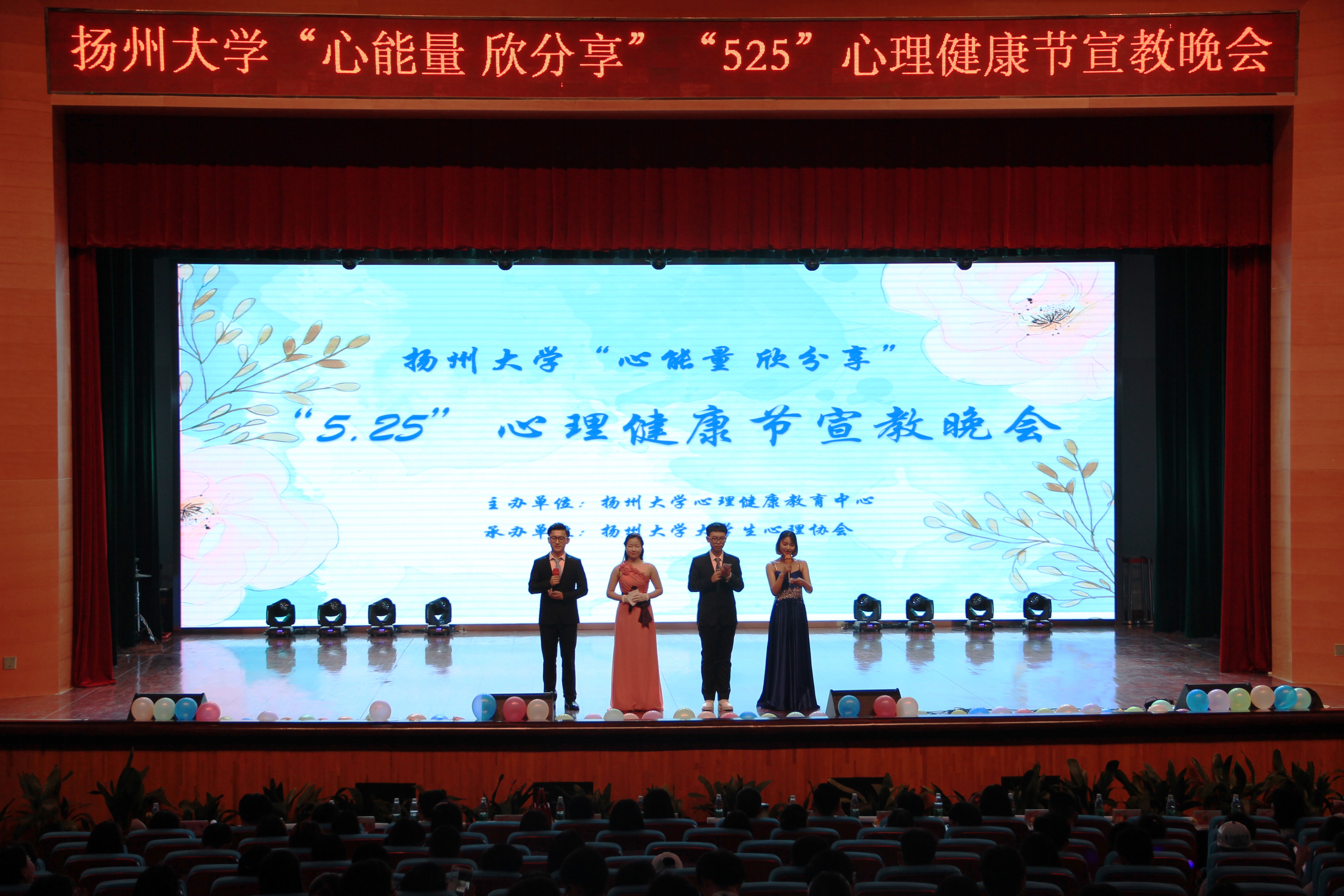 5月20日晚,由心理健康教育中心主办,校大学生心理协会承办的第四届“5.25”“心能量欣分享”心理健康节宣教晚会在扬子津校区文体馆顺利举行。扬州大学心理健康教育中心主任兼学生处副处长侯燕、江苏旅游职业学院心理教育研究中心主任王道荣、江海职业技术学院心理健康中心主任李飞、扬州工业职业技术学院心理健康专职教师姚丽、南京邮电大学通达学院心理健康教师丁慧、南京邮电大学通达学院心理健康专职教师鲁淑红、南京中瑞酒店职业学院心理健康专职教师陈尹、扬州大学心理健康教育中心专职教师张硕以及来自扬州市各高校的心理协会会长出席了本次晚会。
