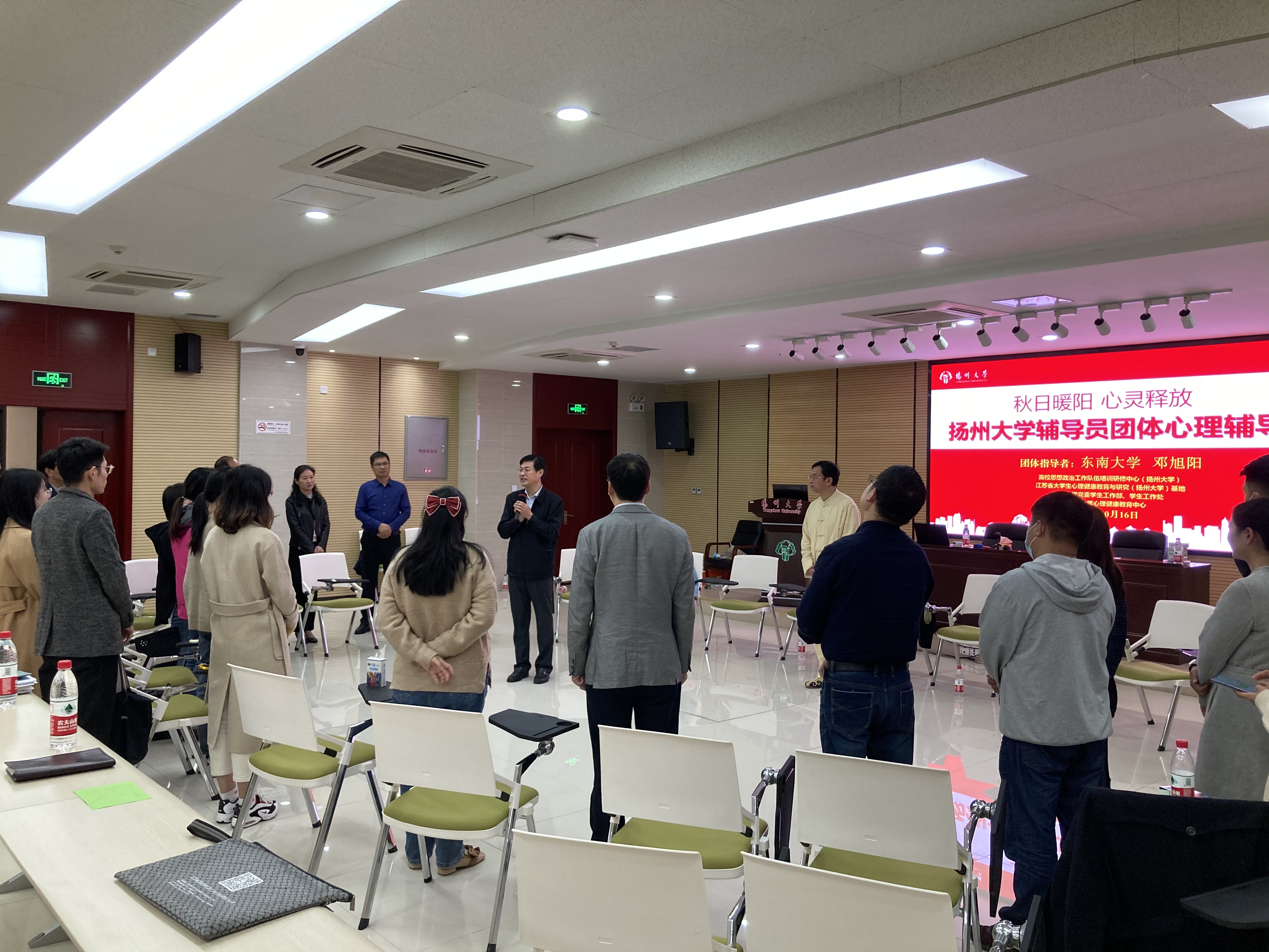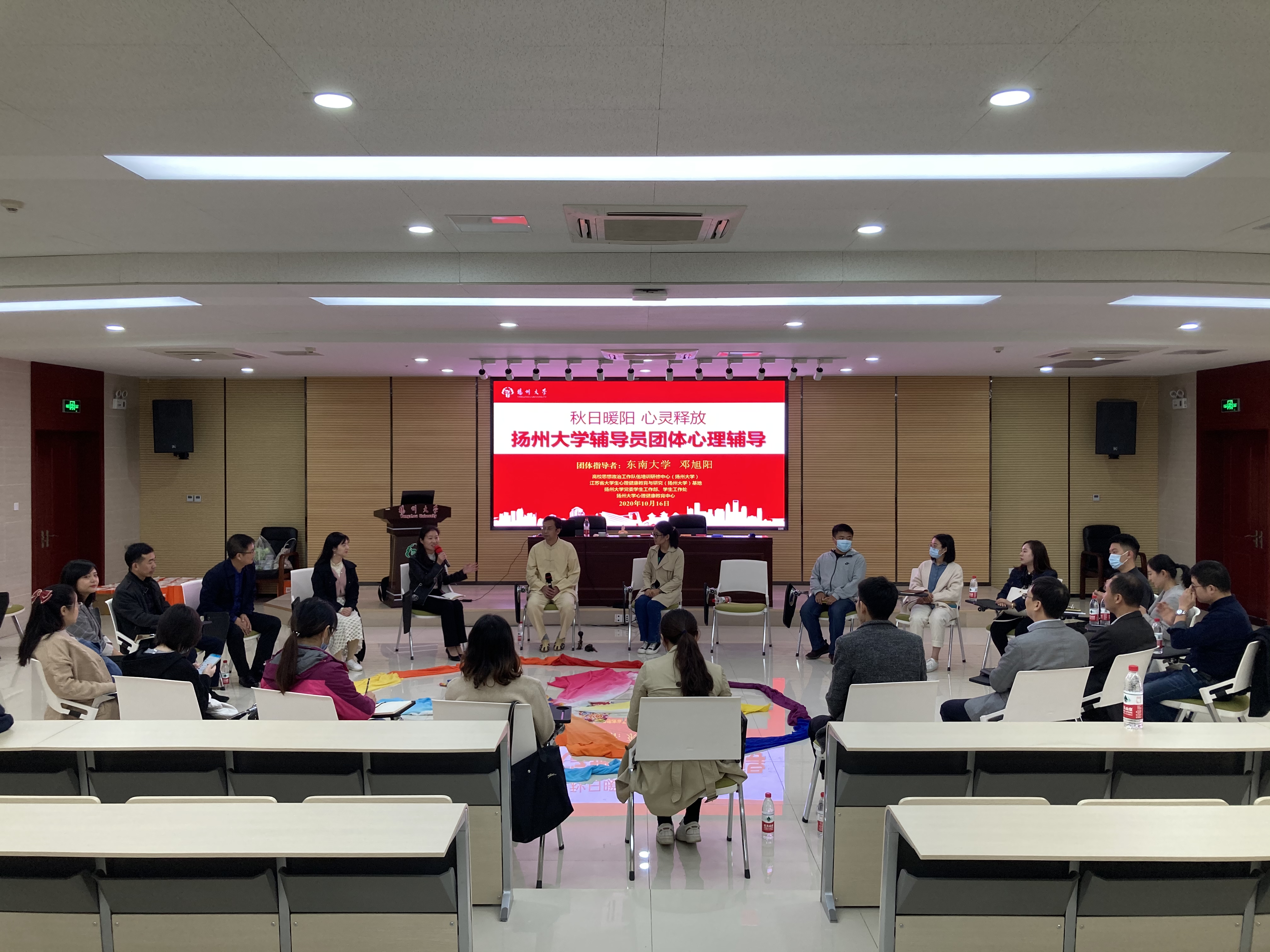 10月16日下午,学校在瘦西湖校区新教学楼三楼报告厅举办“秋日暖阳·心灵释放”辅导员工作坊,东南大学心理健康教育中心主任邓旭阳教授应邀来校开展团体心理辅导活动。