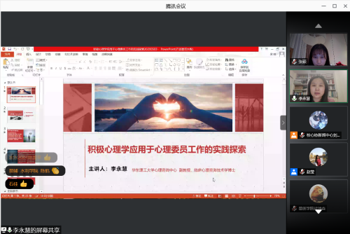 3月17日晚,“朋辈心理咨询员成长营”训练计划第一期开讲,华东理工大学心理中心副主任、全国高校心理委员研究协作组常务理事李永慧副教授应邀开设“积极心理学应用于心理委员工作的实践探索”专题讲座。本次培训依托腾讯会议平台开展,我校各学院心理委员、心理协会骨干近500人在线参与学习。