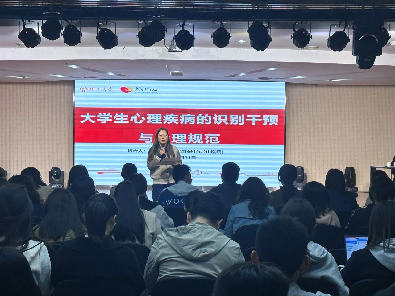 4月11日上午,在扬高校“润心”行动联盟学校辅导员心理健康教育能力提升专题讲座在我校荷花池校区大学生活动中心二楼多功能厅举办。五台山医院纪委书记、医学心理科主任医师王震宇作《大学生心理疾病的识别干预与伦理规范》专题讲座,我校心理健康教育中心主任张平主持讲座。在扬高校辅导员、班主任共百余名老师参加本次讲座。