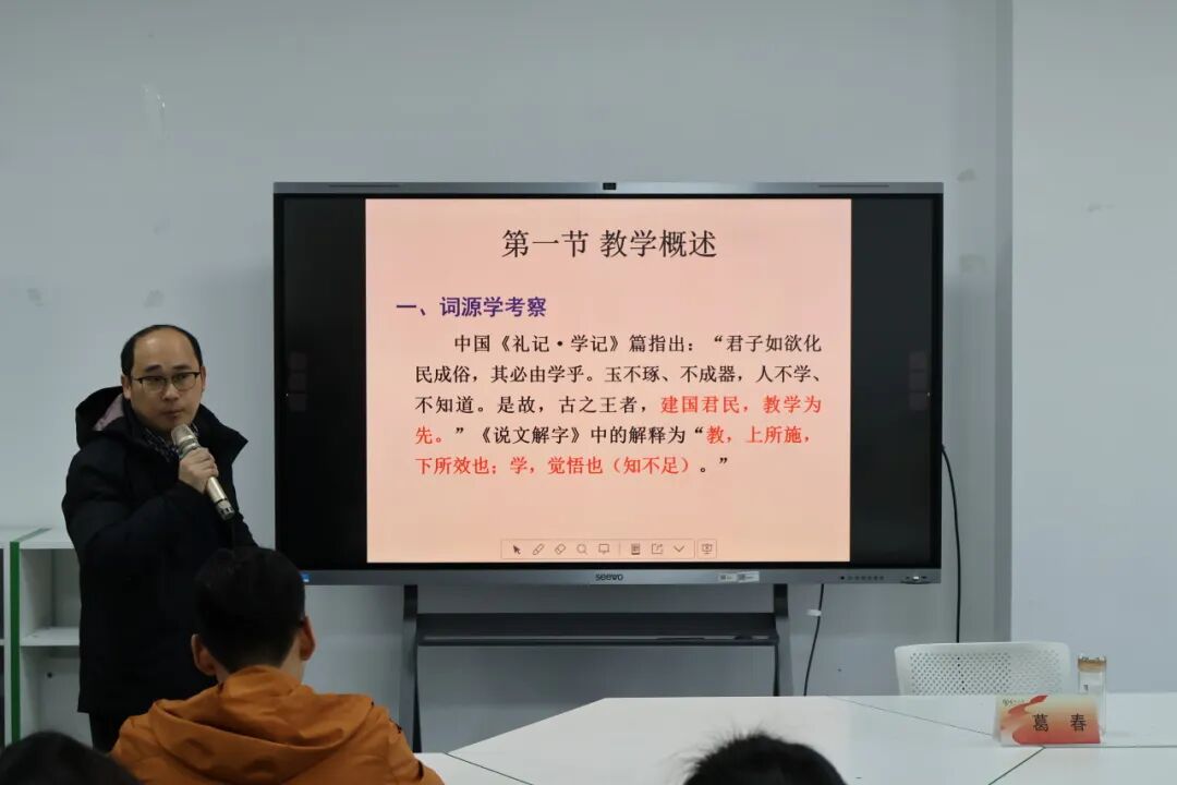 备课会上,葛春老师以“教学理论概述”为主题,从教学概述、教学过程、教学原则与方法、教学组织形式与工作环节、教学评价、教学模式及教学设计七大模块展开系统讲解。他首先阐释教学的本质与基本任务,强调教学是师生共同参与的创造性活动;随后深入剖析教学过程的基本规律与特点,解读不同教学原则与方法的应用场景;在教学组织形式与环节方面,他结合高校课堂特点,强调合理设计教学结构、优化课堂管理的重要性;最后,他就教学评价的发展趋势、典型教学策略的比较分析以及教案设计的规范与创新等作详细阐述。