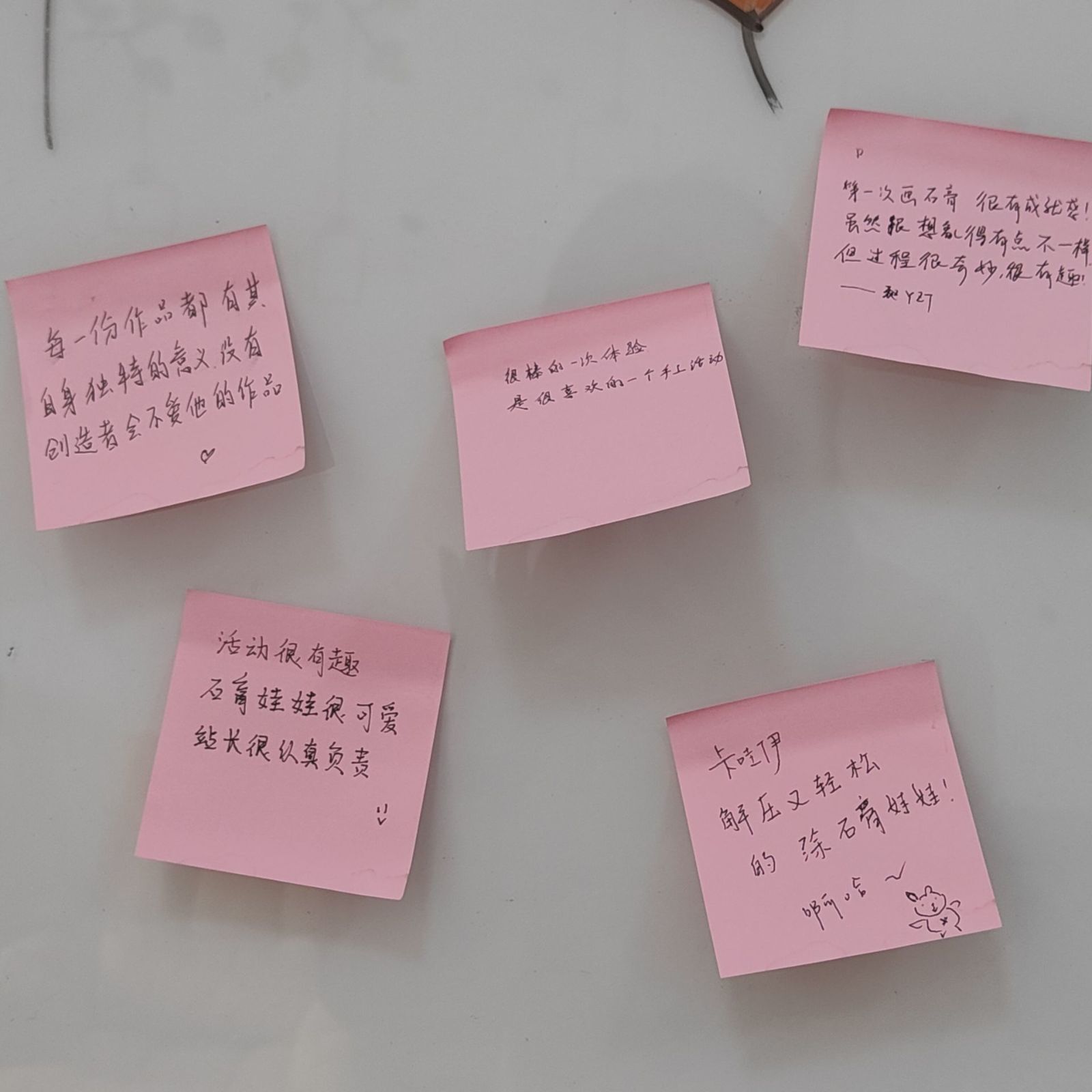 活动中,同学们根据自己的喜欢选取了石膏模型,随后在舒缓的音乐声中开启了颜色填涂的解压之旅,用艺术去表达内心感受,宣泄自身情绪。随后,同学们就自己绘制好的作品进行了分享,交流了自身的创作灵感与在创作过程中的情感体验。最后,同学们在便签上写下了本次活动的心得与对工作站未来活动的祝福与期待。