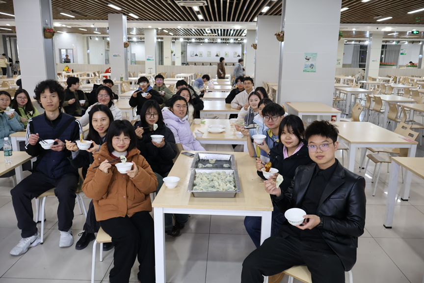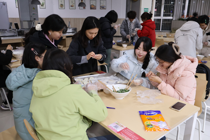 小伙伴们纷纷自发组队、互帮互助,几位心理中心的老师也笑盈盈地加入包饺子的队伍,耐心讲解演示捏褶的技巧,现场热闹又温馨,有人攥着饺子皮手忙脚乱,有人已经熟练地捏出漂亮的柳叶褶,互相聊天打趣间,托盘上渐渐摆满形态各异的“作品”,有规规矩矩的传统弯月饺,有圆滚滚的“胖墩墩”,甚至还有人包出了各式创意款。