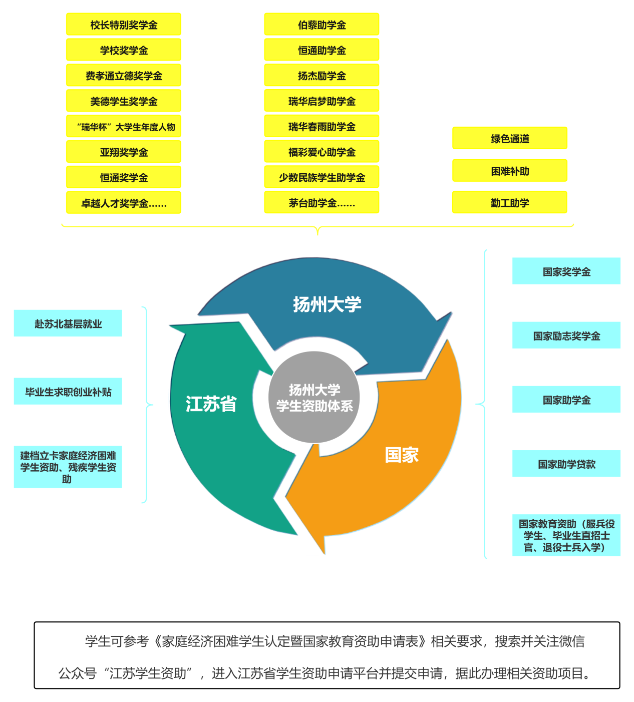 资助扬州大市籍(含扬州市区、高邮、宝应、仪征)家庭经济困难新生,资助标准为每生每年5000元。