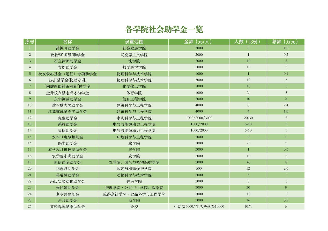 资助家庭经济困难且品学兼优,来自文学院、马克思主义学院、机械工程学院、农学院等15个学院的全日制本科生,资助标准为每生每年3000元,名额为84名。