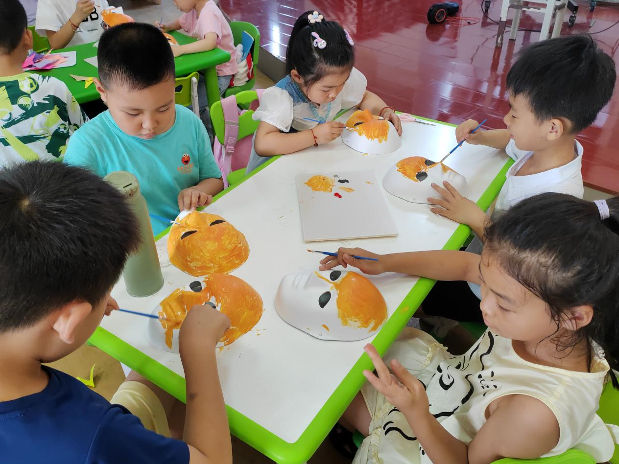 图为小朋友们正专心致志地为王二小的面具上色