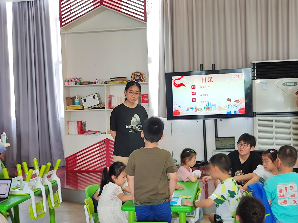 “王二小的一生在悠长的歌声中缓缓落幕,而他的故事却代代传承。小朋友们要铭记王二小勇于奉献的红色底色,无畏苦难,坚勇向前!”在课堂上,陪教团成员以抗日英雄王二小为切入点,深情讲诉了王二小同志牺牲自我、奉献革命的壮烈故事。故事讲解后,陪教团成员带领孩子们表演“抗日英雄王二小”话剧。勇敢而不失机智的王二小,凶狠残暴的日本鬼子,勇往直前的八路军……故事中的人物通过孩子们的演绎重新有了生命,在一正一邪的对抗中孩子们更加深入感悟那一段可歌可泣的红色岁月。