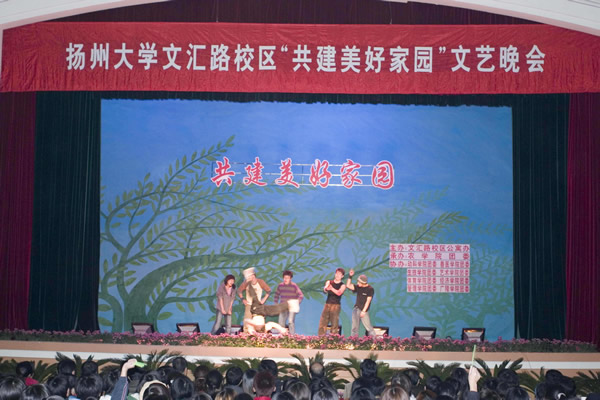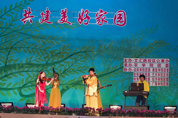 2005年11月30日晚,文汇路校区大礼堂内,灯火通明,人头攒动,掌声不断,文汇路校区“共建美好家园”文艺晚会在这里隆重上演,校长助理郭礼和、后勤集团党委宋亭华书记、学生处夏泽清副处长、后勤管理处张武阳副处长、后勤集团管纪薪副总经理、农学院党委余吉生副书记、动科学院党委吴圣龙副书记、兽医学院党委俞洪副书记、生技学院党委马雷副书记、经济学院党委杨春燕副书记、管理学院党委赵春丹副书记、学生公寓中心陈锦贵主任以及相关学院团委老师及1500多名师生代表欣赏了文艺晚会。
