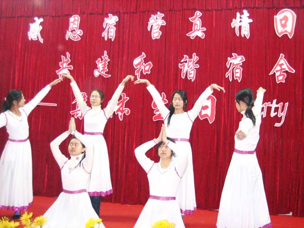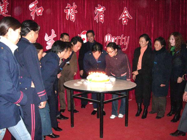联欢会上学生代表和宿管工作人员代表上台发言,旅游烹饪学院的学生为宿管工作人员举办集体生日Party。学院领导和宿管工作人员一起切蛋糕、吹蜡烛。同学们为宿管人员献上了歌舞、相声等精彩节目。通过此次活动,拉近了宿管与同学们之间的距离,同时也丰富了宿舍文化。