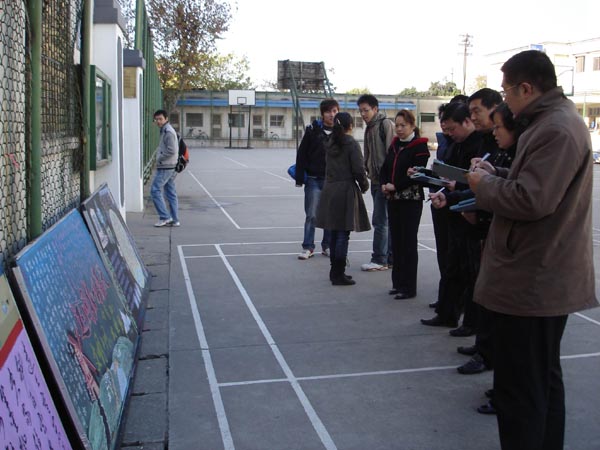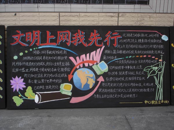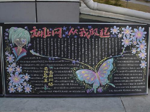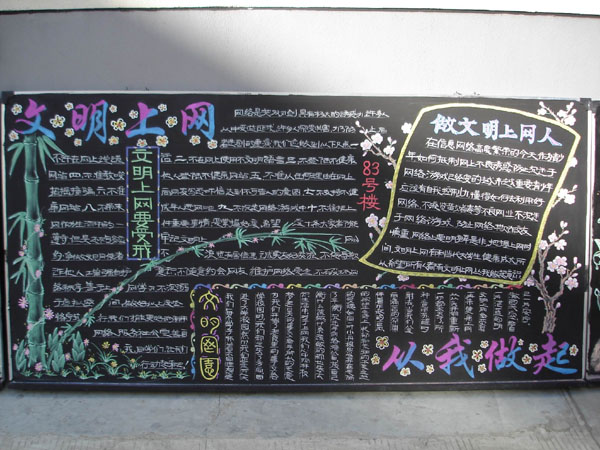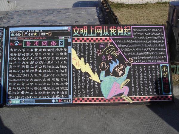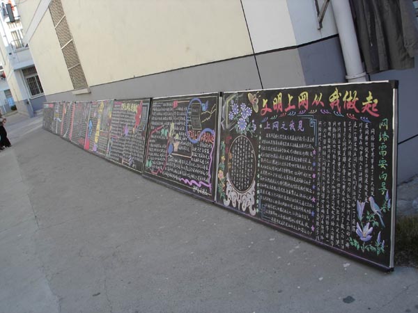 在学生公寓楼内设立黑板报,是我校开展校园文化进公寓的一项长效措施。2001年以来,我校学生公寓管理中心通过在每幢学生公寓楼内建立黑板报,每月两期,管理员负责,学生参与,内容紧扣形势、学校重大活动和“家”事。既丰富了“家”文化,起到潜移默化的育人作用,又增进了管理人员与同学们之间的相互沟通、理解和支持。通过专题黑板报评比活动,不断提高黑板报的质量。2007年11月27日,我校开展了以“文明上网 从我做起”为主题的专题黑板报评比活动,参评黑板报共60多块,板报内容来自于公寓管理员和学生,贴进公寓生活,图文并茂,能起到加强对学生思想引导、知识传授、信息传递、情感交流,教育引导广大学生健康、文明上网,起到很好的促进作用,为学生所喜爱。