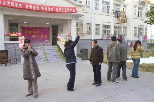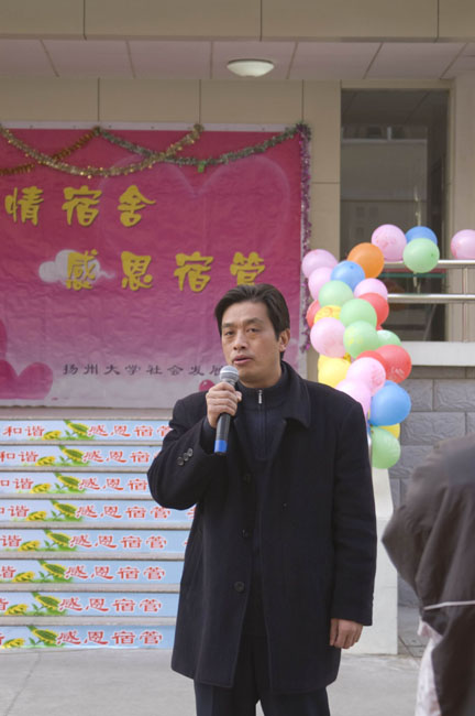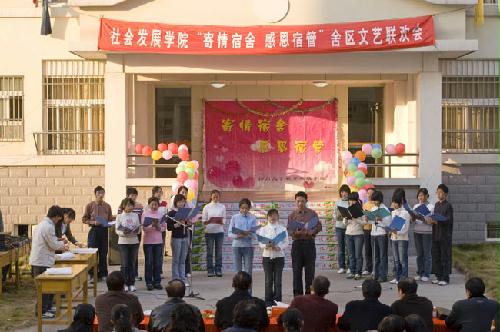 2007年11月28日下午,社会发展学院在瘦西湖校区宿舍区举办“感恩宿管共建和谐”文艺联欢会。同学们为校第八届学生宿舍文化建设月和瘦西湖校区的宿舍管理员工献上了一场精彩的文艺演出。校后勤党委副书记、后勤服务集团党总支书记朱太康,校学工部副部长、学生处副处长夏泽清观看了演出并致辞。社会发展学院党委副书记胡学春,校后勤服务集团公寓管理中心主任李永刚,校后勤服务集团公寓管理中心副主任蒋培林、宗晓武,社会发展学院团委陈克勤、华南书记,瘦西湖校区宿管办公室主任吉义龙以及全体宿管工作人员一同观看了演出。
