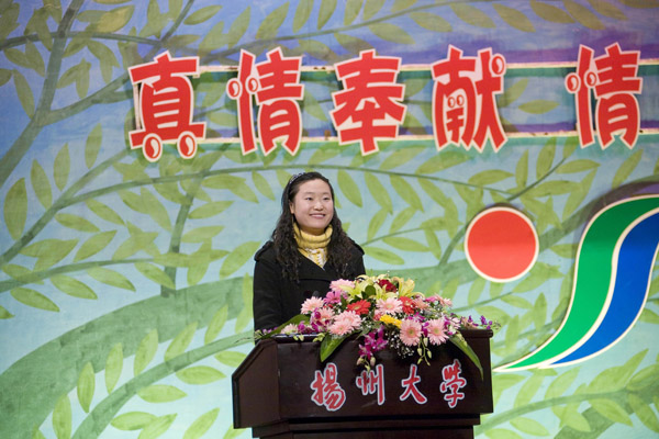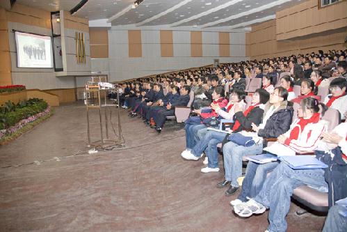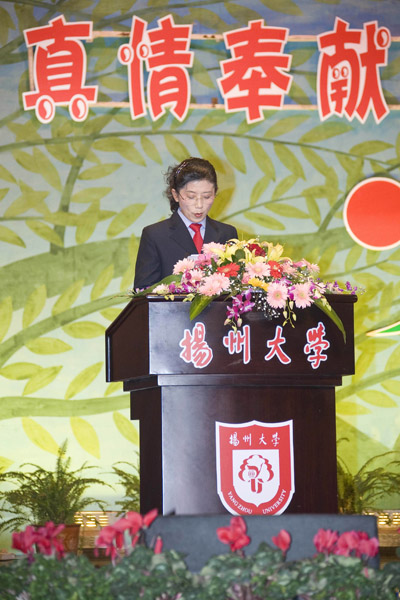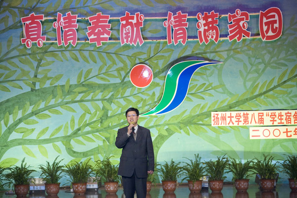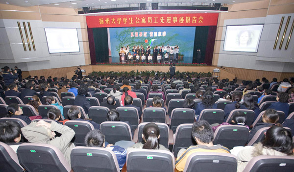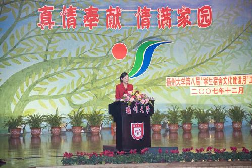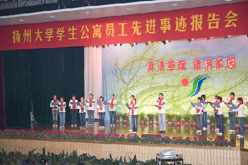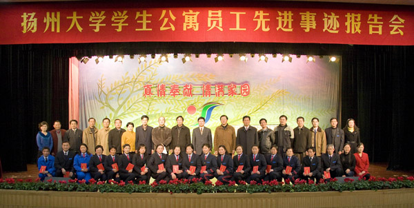 2007年12月6日晚,扬州大学第八节“宿舍文化建设月”工作小组在大学生活动中心楼小剧场举办了以“真情奉献 情满家园”为主题的学生公寓员工先进事迹报告会。校党委副书记芮鸿岩,副校长胡家兴,校长助理、后勤党委书记郭礼和,党委办公室、党委宣传部、校团委、教务处、学生处、团委、国有资产管理处、后勤管理处、基建处、后勤服务集团部门等负责人以及各学院党委副书记、各学院团委书记出席了本次报告会。