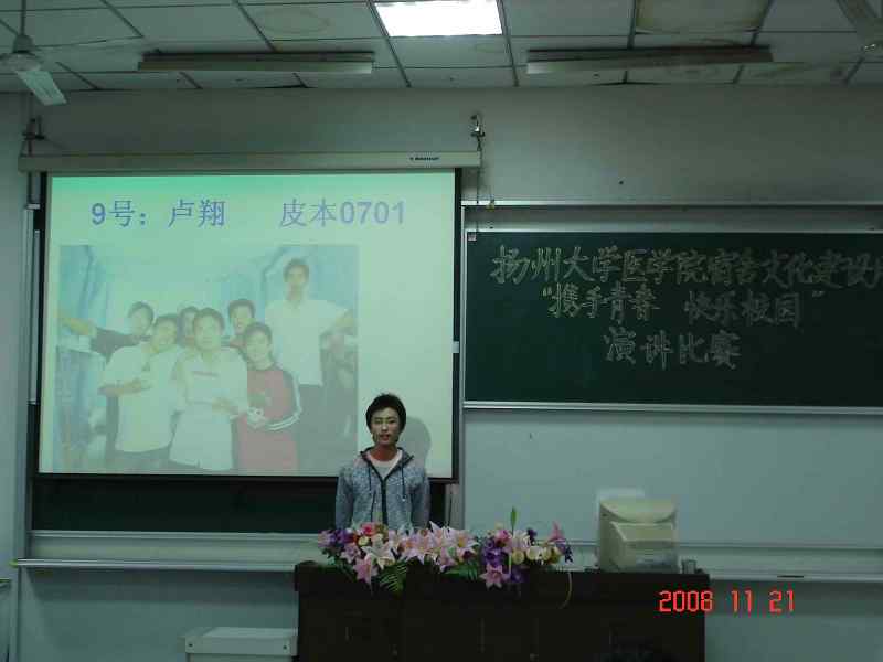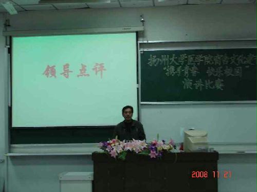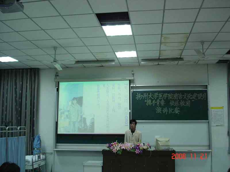 2008年11月21日晚,为积极响应学校举行的第九届“宿舍文化建设月”活动,由医学院团委、淮海路校区宿管办主办的以"携手青春,快乐校园"为主题的演讲比赛于医学院教学楼