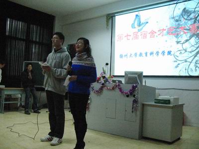 2009年11月29日下午,教育科学学院在瘦西湖校区文科楼举办了第七届“宿舍才艺大赛”,学生们以宿舍为单位全员参与活动,既有宿舍成员默契配合的集体表演,也有宿舍内的每一个成员的才艺施展,将活动掀起了一个个高潮,较好地展现了学生们在宿舍这个“温馨家园”中的成长和快乐。 学生工作处夏泽清副处长和教育科学学院党委赵晓兰副书记出席了本次活动。