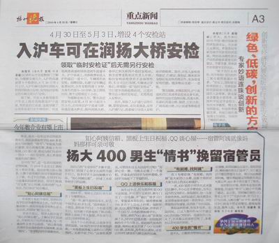 2010年4月28日,《扬州晚报》报道了扬大400名男生“情书”挽留宿管阿姨的事迹。