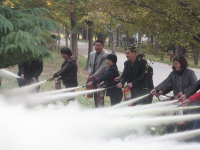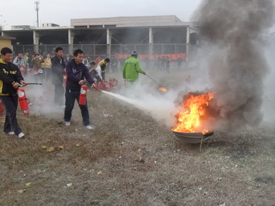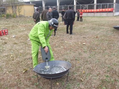 消防知识讲解结束,消防科同志向在场人员讲解并演示了灭火器使用的操作程序。受培训人员进行了扑救火灾的操作演练和火灾逃生演习。