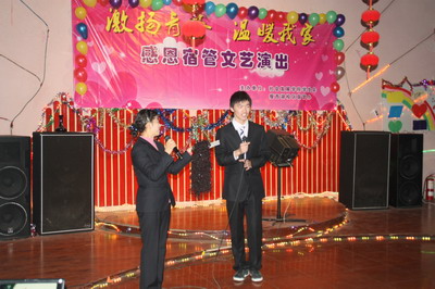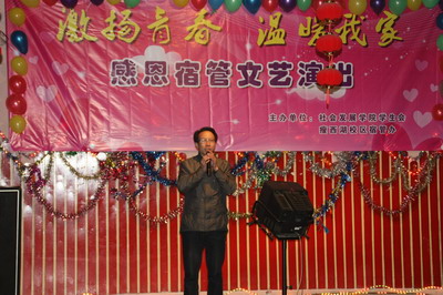 “纵然来自天涯海角,今天我们都是你们的孩子。无论是否曾经相识,从此你们就是我们的母亲。在感恩节到来之际,我们更应该感激,感激我们的宿管阿姨,因为他们让我们的成长空间更加健康和谐!”在主持人慷慨激昂的一段开场白下,演出拉开了大幕。