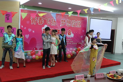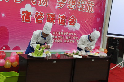 整个会场被精心地用气球和彩旗布置,显得和谐而温馨。各学院和各公寓管理站均纷纷献上了各类不同的精彩节目,舞蹈串烧、环保时装表演、手语《和你一样》、小品《男生宿舍》、魔术表演以及独具旅烹学院特色的水果拼盘、雕刻表演等,让在场的嘉宾观众享受了一场视觉、听觉、味觉的饕餮盛宴。在节目表演间主持人还穿插了两场与嘉宾观众互动的游戏环节“心随绳动”、“是是非非”,领导、老师及同学们的积极参与将联谊会的气氛一度推向了高潮,一时整个会场笑声阵阵、掌声不断。在联谊会的最后,贴心的同学们还特意为宿管叔叔阿姨们准备了一段视频以表达对他们深深的感恩之情,视频里剪辑了他们忘我工作、热心服务的点点滴滴以及同学们热心献上的一句句诚挚祝福,视频结束后由陶春明处长致辞,再次表达了对宿舍管理人员的衷心感谢并加上了对同学们的支持和鼓励。最后,联谊会在同学们持久不息的掌声中圆满结束。