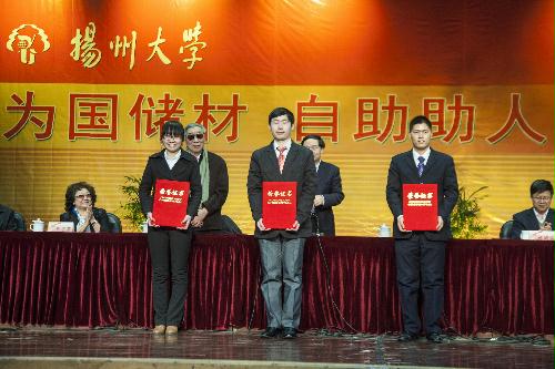 3月25日下午,学校在荷花池校区大学生活动中心小剧场隆重召开2011-2012学年朱敬文奖助学金颁奖大会。朱敬文先生的大女婿蒋宁熙先生,三女儿朱惠英女士、三女婿曾卓章先生,四女儿朱文英女士,五女儿朱馥英女士、五女婿陈冠煌先生,长孙朱承德先生,香港朱敬文教育基金会大陆总代表、原苏州大学校长陈克潜教授夫妇,苏州大学凤凰传媒学院党委书记赵阳,我校朱敬文奖助学金评委会主任、校长焦新安出席会议。校党委副书记、副校长芮鸿岩宣读获得朱敬文奖、助学金名单。学生处赵晓兰副处长主持会议。