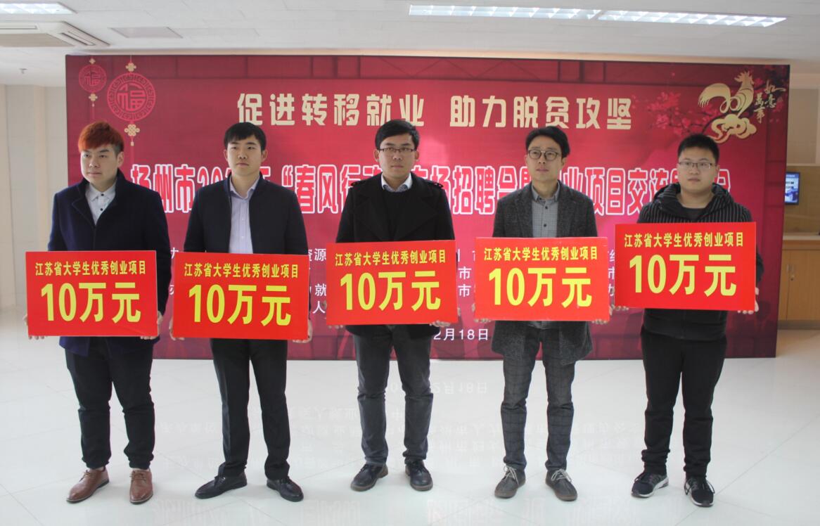 2月18日,扬州市人力资源和社会保障局举办扬州市2017年“春风行动”专场招聘会暨创业项目交流展示会,并代表省人社厅为“2016年度省级创业示范基地”“2016年度省大学生优秀创业项目”颁发奖金。