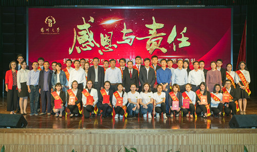 5月12日下午,学校在荷花池校区大学生活动中心小剧场隆重举行“感恩与责任”2015-2016学年国家奖学金、国家励志奖学金、朱敬文奖学金颁奖典礼。校长焦新安出席并讲话。校党委副书记、副校长叶柏森主持颁奖典礼。焦新安、叶柏森、刘祖汉、胡效亚分别为国家奖学金、朱敬文特别奖学金获得者以及国家励志奖学金获奖代表颁奖。