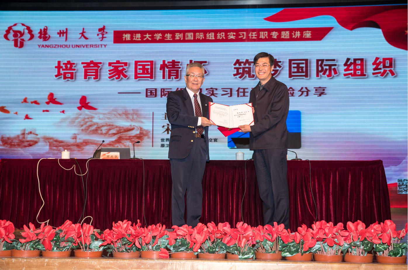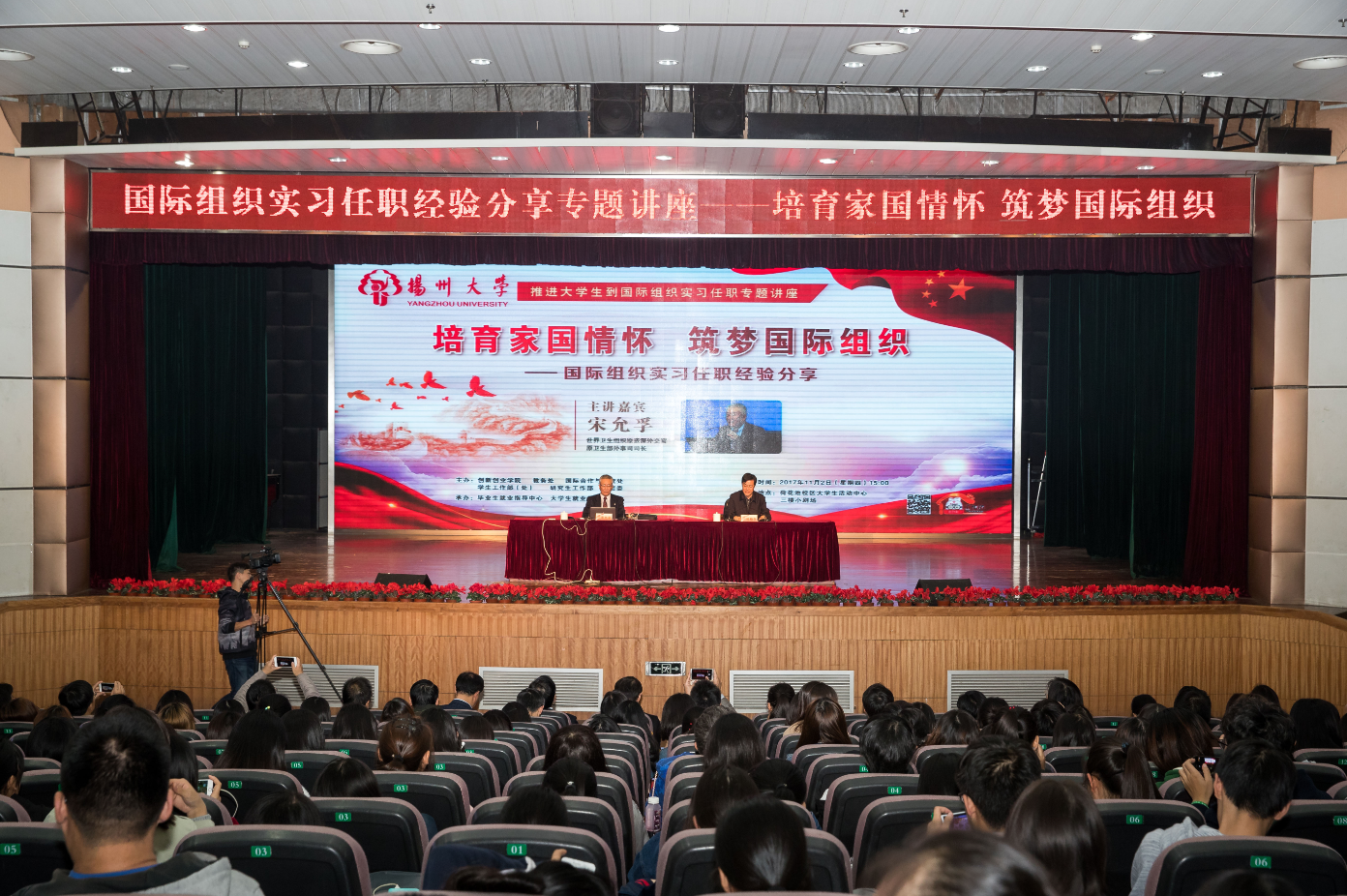 11月2日,世界卫生组织前高级官员、原卫生部外事司司长宋允孚先生应邀访问学校,在荷花池校区大学生活动中心小剧场为师生作题为“培育家国情怀,筑梦国际组织——国际组织实习任职经验分享”专题讲座,并受聘为我校兼职教授、国际组织人才职业发展导师。校长焦新安会见宋允孚先生,校党委副书记叶柏森主持报告会,副校长俞洪亮出席相关活动。