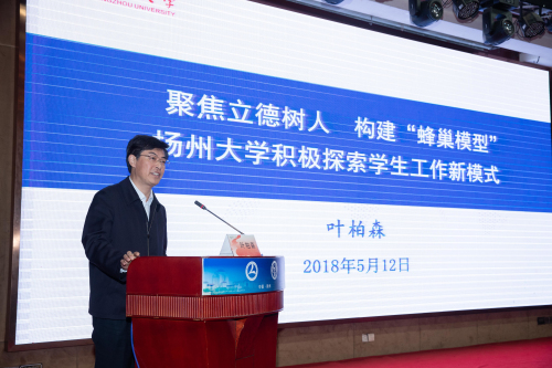 本次会议还专门设立了书记校长论坛,来自江苏大学、中北大学、重庆城市管理职业学院、扬州大学等高校领导围绕当下高校学生工作中辅导员队伍建设、毕业生就业创业问题发表了主题报告。其中,我校党委副书记叶柏森所作的《聚焦立德树人构建“蜂巢模型”,扬州大学积极探索学生工作新模式》报告,以统揽全局的视野、新颖独特的视角、科学合理的阐释,引起了与会人员的强烈反响。