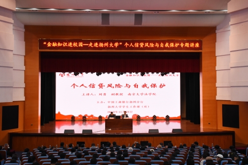 11月18日晚,由中国工商银行扬州分行、我校学生工作部(处)共同举办的“金融知识进校园-个人信贷风险与自我保护”金融知识专题讲座在扬子津校区文体馆举办。本次讲座由南京大学法学院副教授刘勇主讲,中国工商银行扬州分行副行长钱长明,副总经理顾军,校财务处处长陆伟刚,副处长陆毅、曹宏进、姚哲等出席讲座。讲座由校党群党总支书记、学生工作部(处)副部(处)长居学明主持。