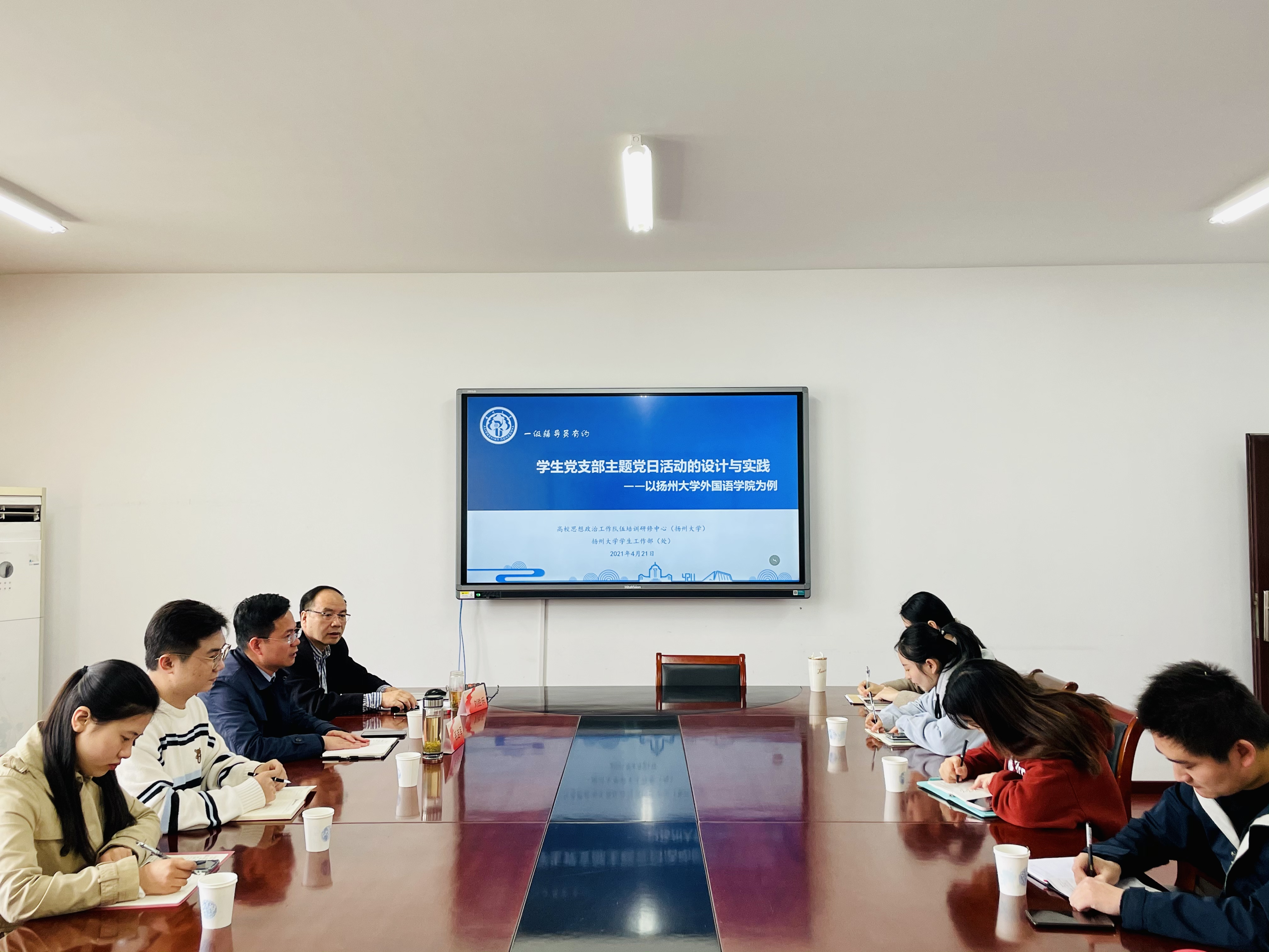 4月21日上午,由高校思想政治工作队伍培训研修中心(扬州大学)、学生工作部(处)举办的“一级辅导员有约”辅导员沙龙活动在外国语学院会议室举办。一级辅导员刘胜乐老师围绕“三个认识、三个案例、三个体会”,与结对共建的12名年轻辅导员共同探讨“学生党支部主题党日活动的设计与实践”的创新方式。