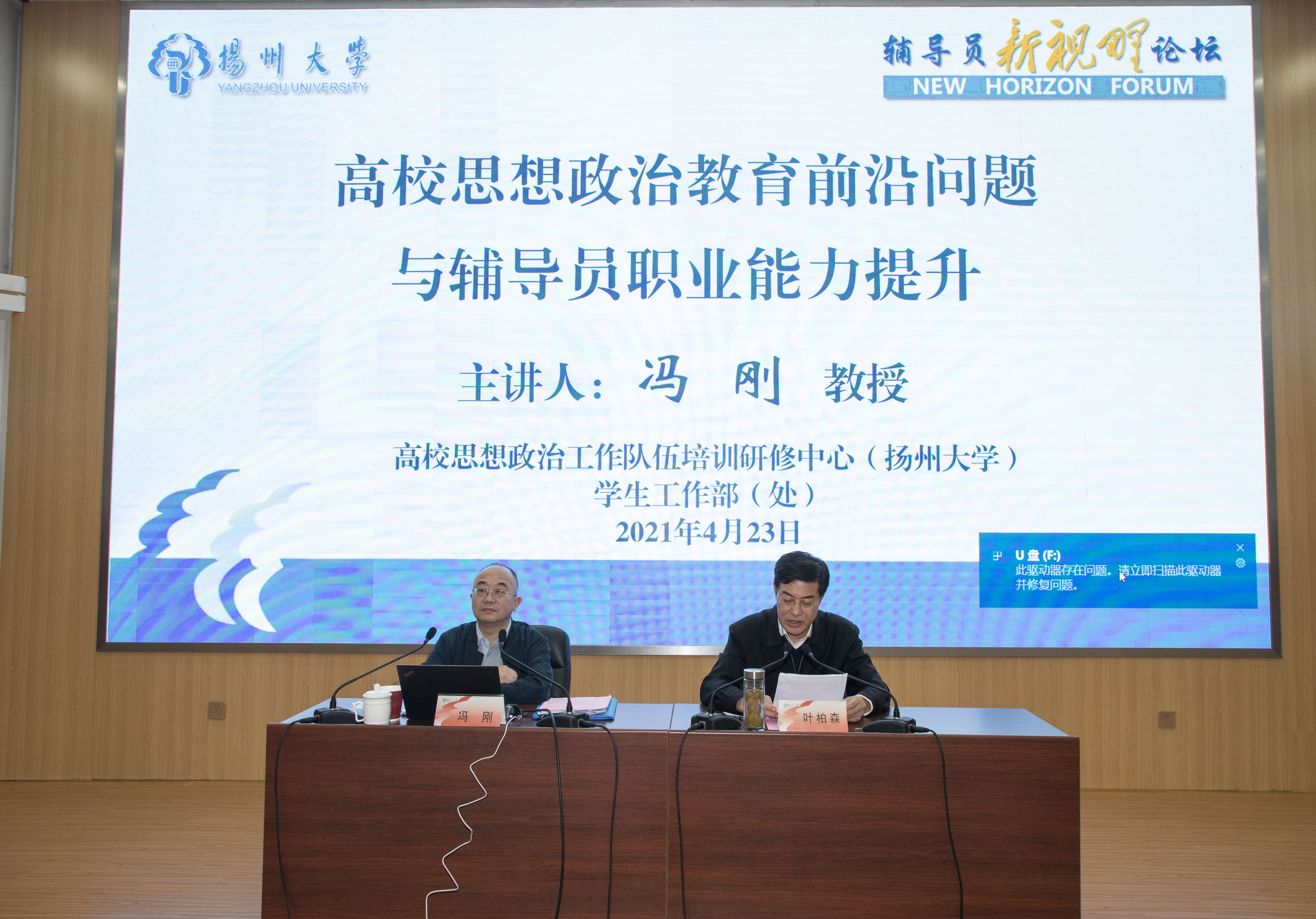 4月23日下午,学校在荷花池校区逸夫图书馆报告厅举行辅导员“新视野”论坛。北京师范大学马克思主义学院教授、博士生导师,教育部思想政治工作司原司长冯刚应邀作题为《高校思想政治教育前沿问题与辅导员职业能力提升》的专题报告。校党委副书记叶柏森主持论坛。