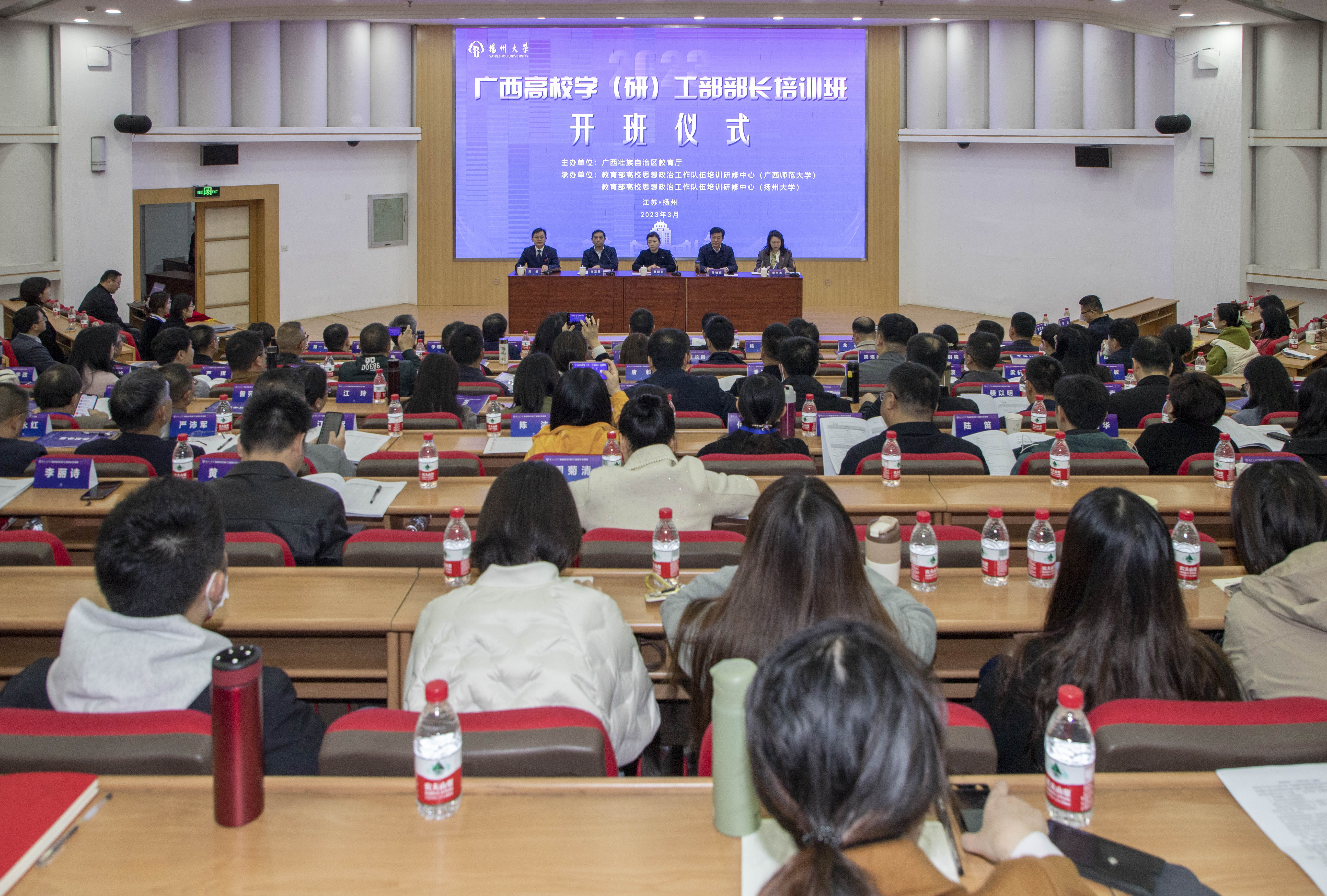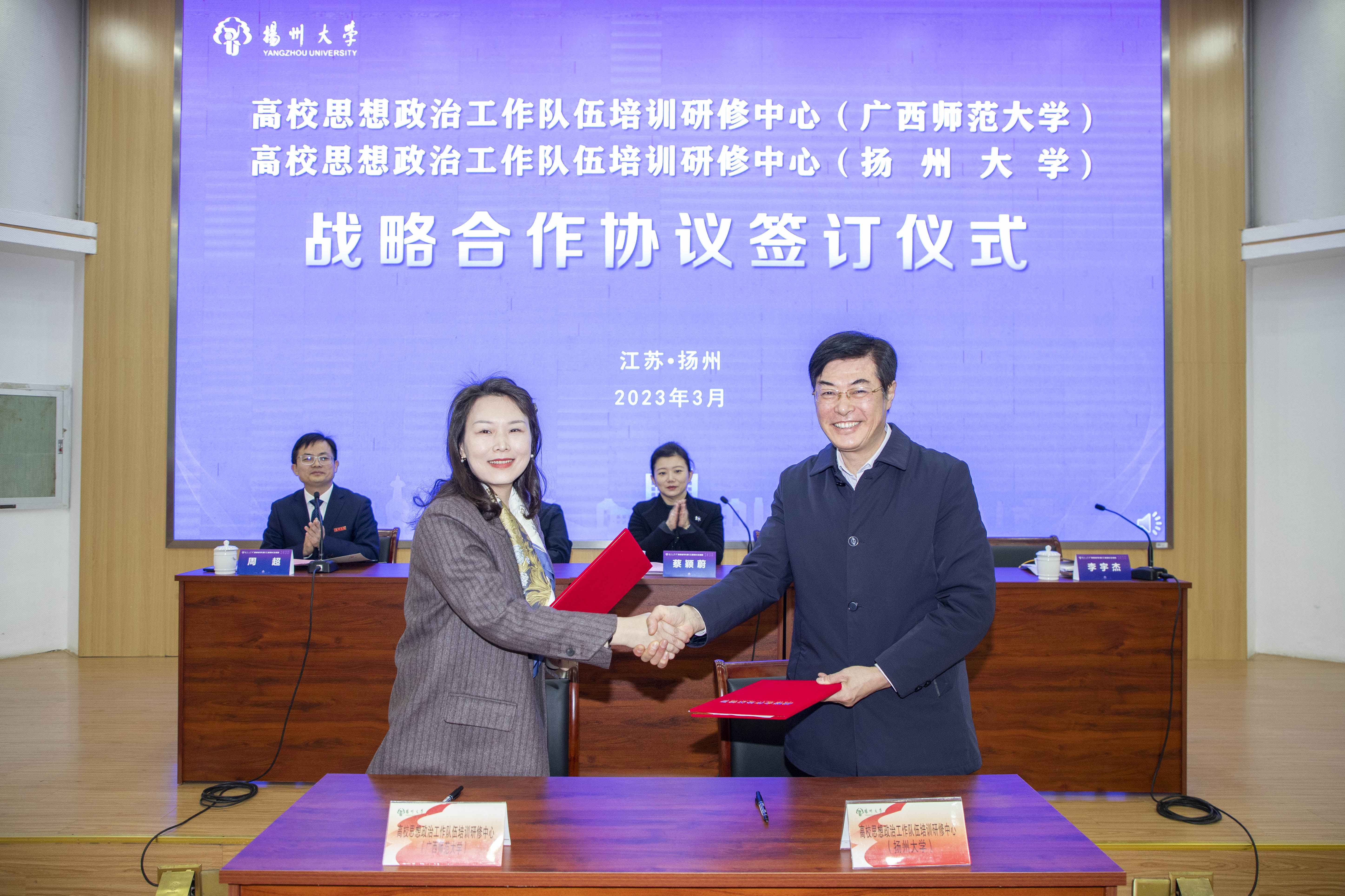 3月14日至17日,由广西壮族自治区教育厅主办,教育部高校思想政治工作队伍培训研修中心(广西师范大学)、教育部高校思想政治工作队伍培训研修中心(扬州大学)承办的2023年广西高校学(研)工部部长培训班在我校举行。副校长蔡颖蔚出席开班仪式并致辞,江苏省教育厅高校学生处处长许正亚出席开班仪式并讲话。教育部高校思想政治工作队伍培训研修中心(扬州大学)主任叶柏森与教育部高校思想政治工作队伍培训研修中心(广西师范大学)代表签订战略合作协议。