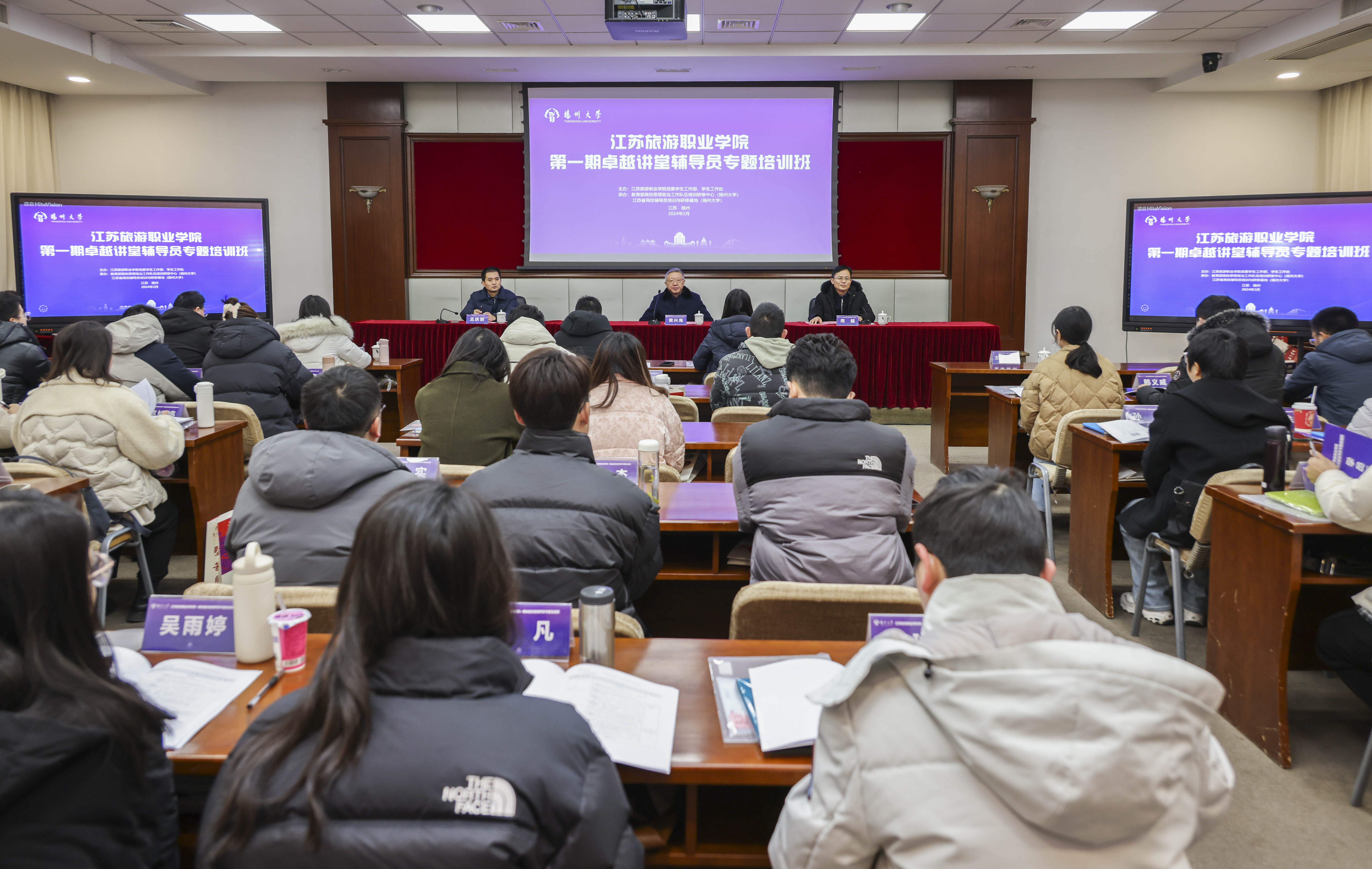2月22日-2月23日,由教育部高校思想政治工作队伍培训研修中心(扬州大学)、江苏省高校辅导员培训与研修基地(扬州大学)承办的江苏旅游职业学院第一期卓越讲堂辅导员专题培训班在我校举行。江苏旅游职业学院党委副书记黄兴海、江苏旅游职业学院学生工作部(处)部(处)长王庆贺等出席开班仪式。